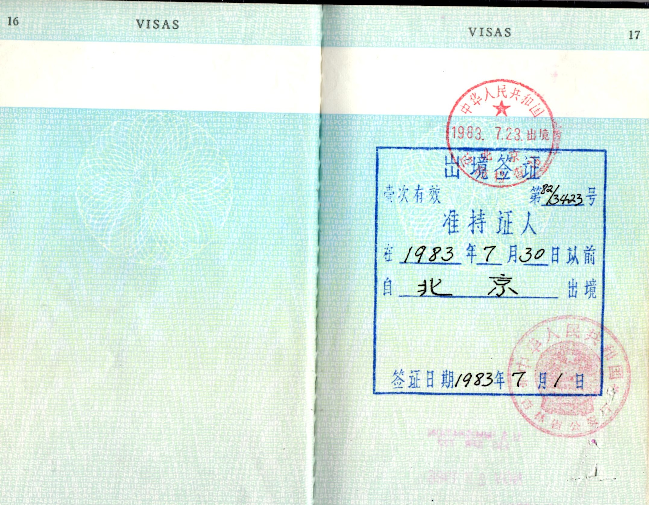 | 7/1/83 | Exit permit from China. |