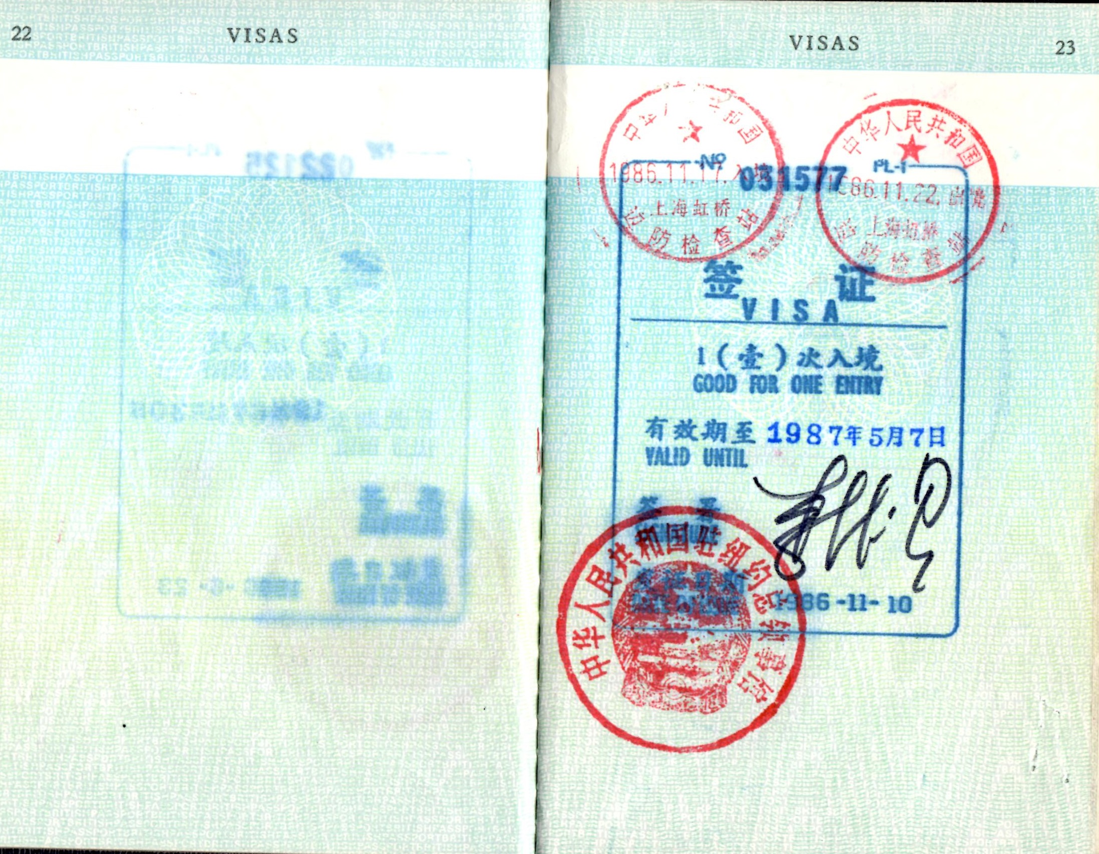 | 11/10/86 | China visa. |