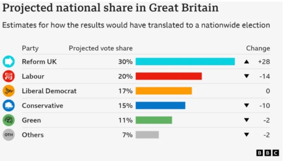 The mighty surge of votes for Nigel Farage's milquetoast-nationalist Reform Party in England's May 1 local elections came from slobs. The snobs voted for globalists: for the Labour-Conservative uniparty and the fringe Liberal-Democrats and Greens. Projecting the votes to a general-election contest still suggests a 70-to-30 victory for snobs over slobs; the slobs won here because turnout was low and local issues dominated.