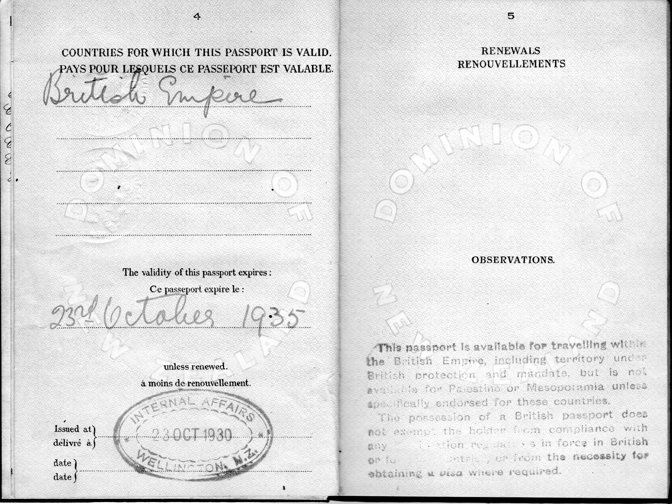 Here are the inside cover and first five pages of John Robert Derbyshire's New Zealand passport, issued in Wellington on October 23rd, 1930. The other pages of the passport are all blank.