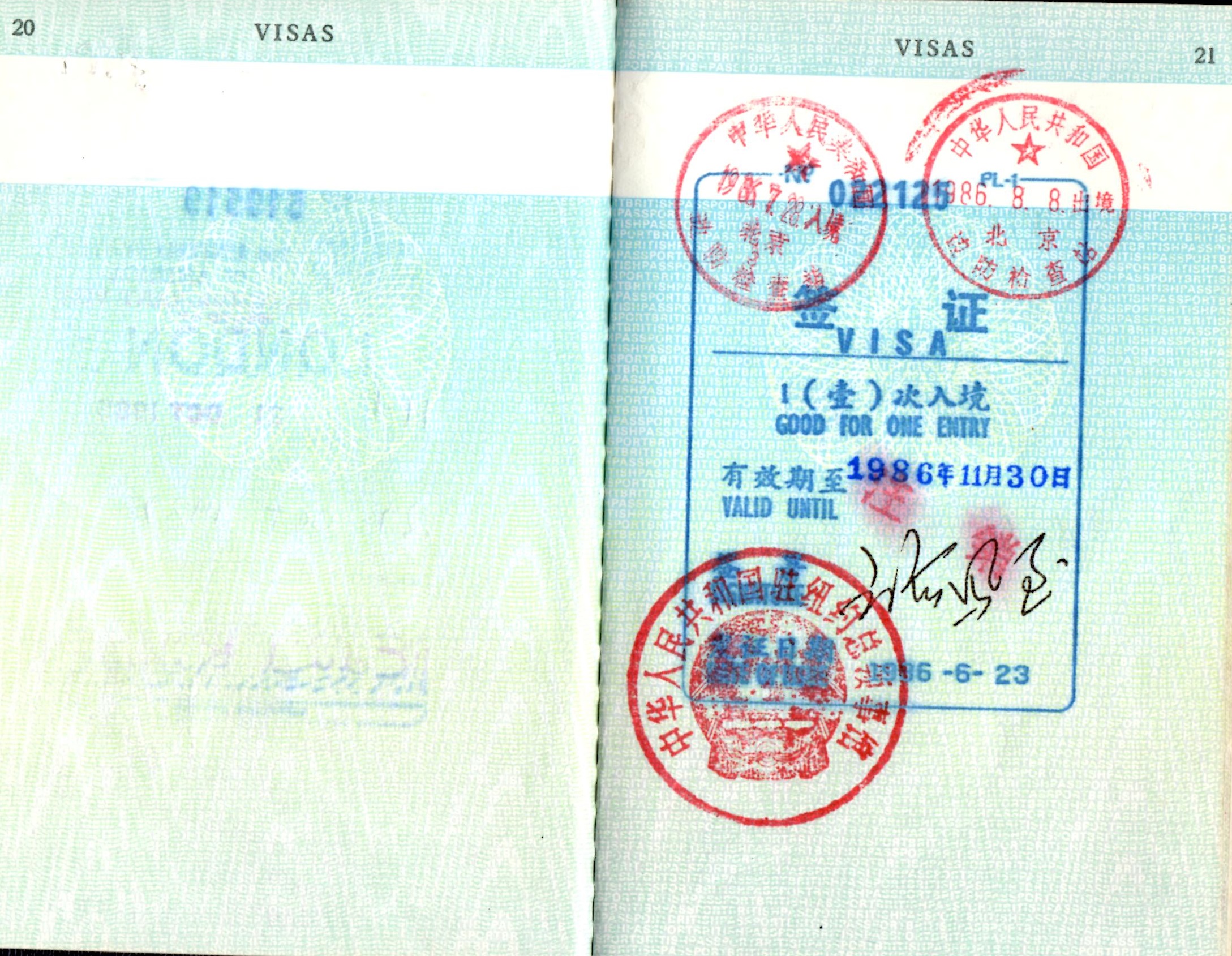 | 6/23/86 | China visa. |