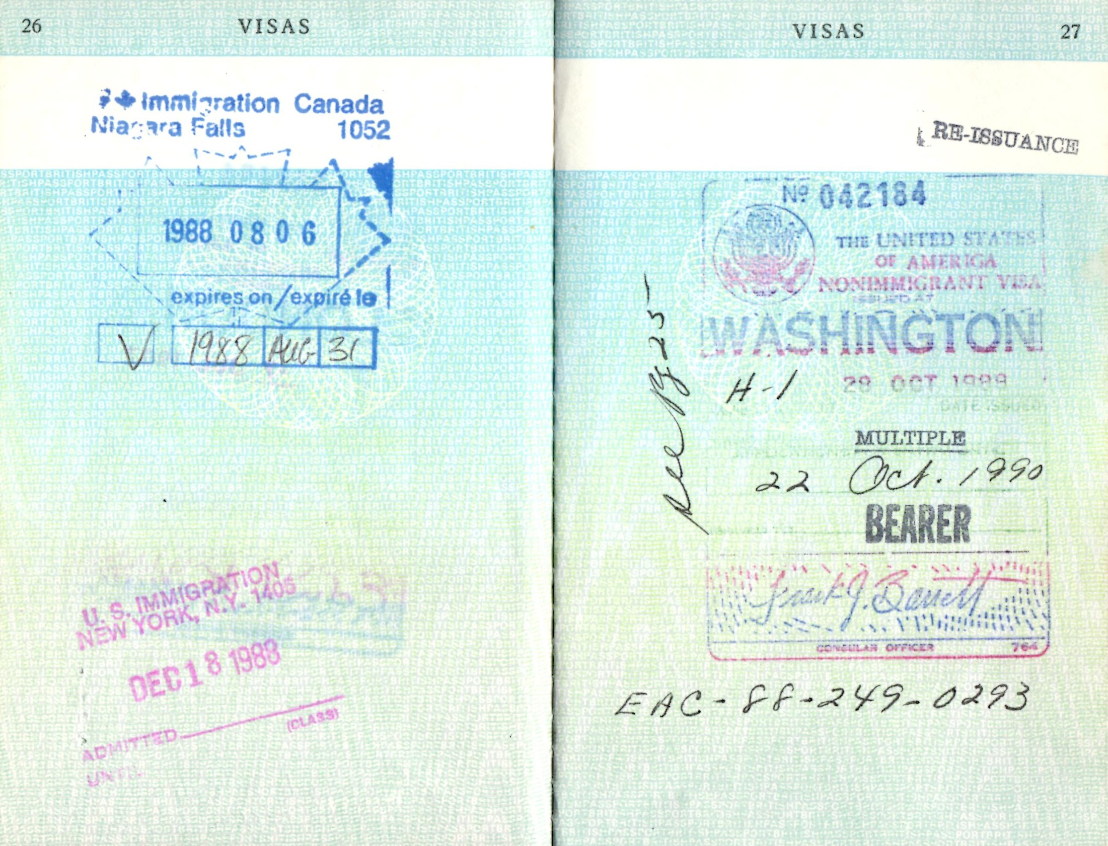 | 10/28/88 | U.S. visa (H-1) renewed. |
