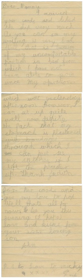 quite well now despite the fact that my stomach is plastered with bandages through which I can just see my