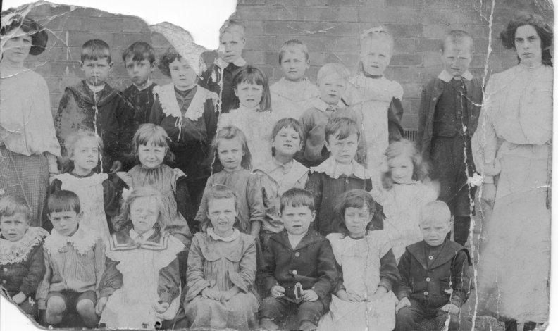 Dad in a school picture. He is the rightmost child on the back row, next to the teacher. |