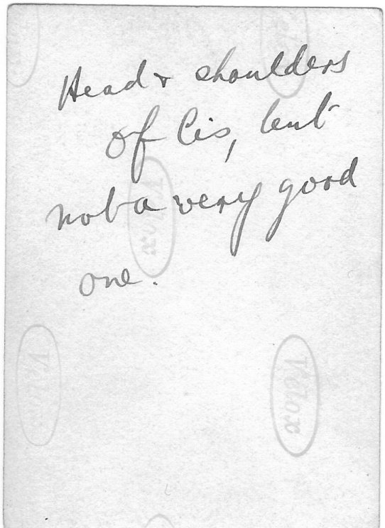 A note on the back of the previous photograph, in Uncle Tommy's handwriting: "Head & shoulders of Cis, but not a very good one." |
