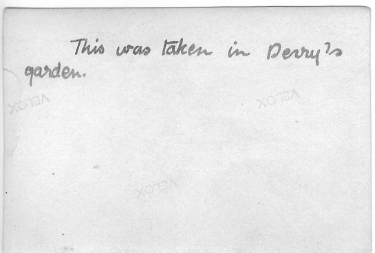 A note on the back of the previous photograph, in Cissie's handwriting: "This was taken in Derry's garden." Fred Derry was the man Cissie married. I suppose they were courting at this point. |