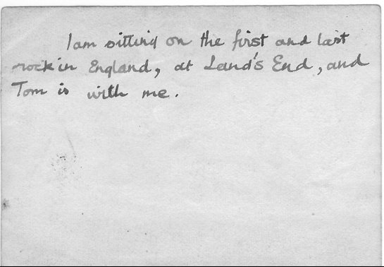 A note on the back of the previous photograph, in Cissie's handwriting: "I am sitting on the first and last rock in England, at Land's End, and Tom is with me." |