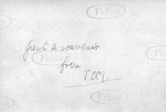 A note on the back of the previous photograph, in Tommy's handwriting: "Just a souvenir from TOM." |