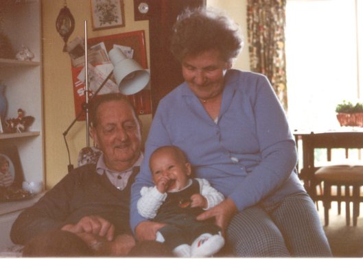 Mum and Dad with Dad's first great-grandchild, James, May 18, 1983. James (five months old here) is the first child of Robert Derbyshire, my brother Noel's older boy. James Derbyshire is therefore my great-nephew. |