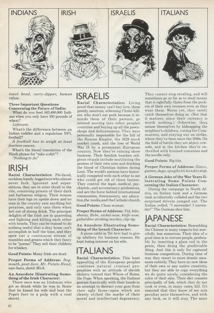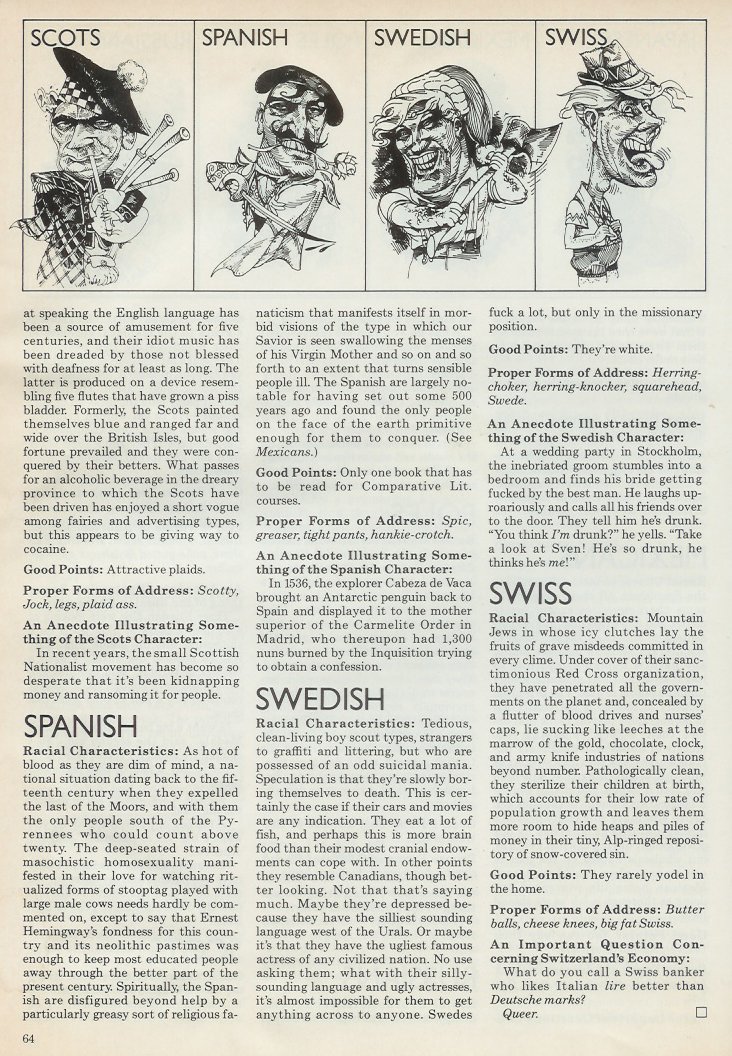 For my article "When Foreigners Were Funny" I needed an instance of Americans finding foreigners funny. The thing that came most readily to mind was P.J. O'Rourke's "Foreigners Around the World" piece in the May 1976 issue of National Lampoon.