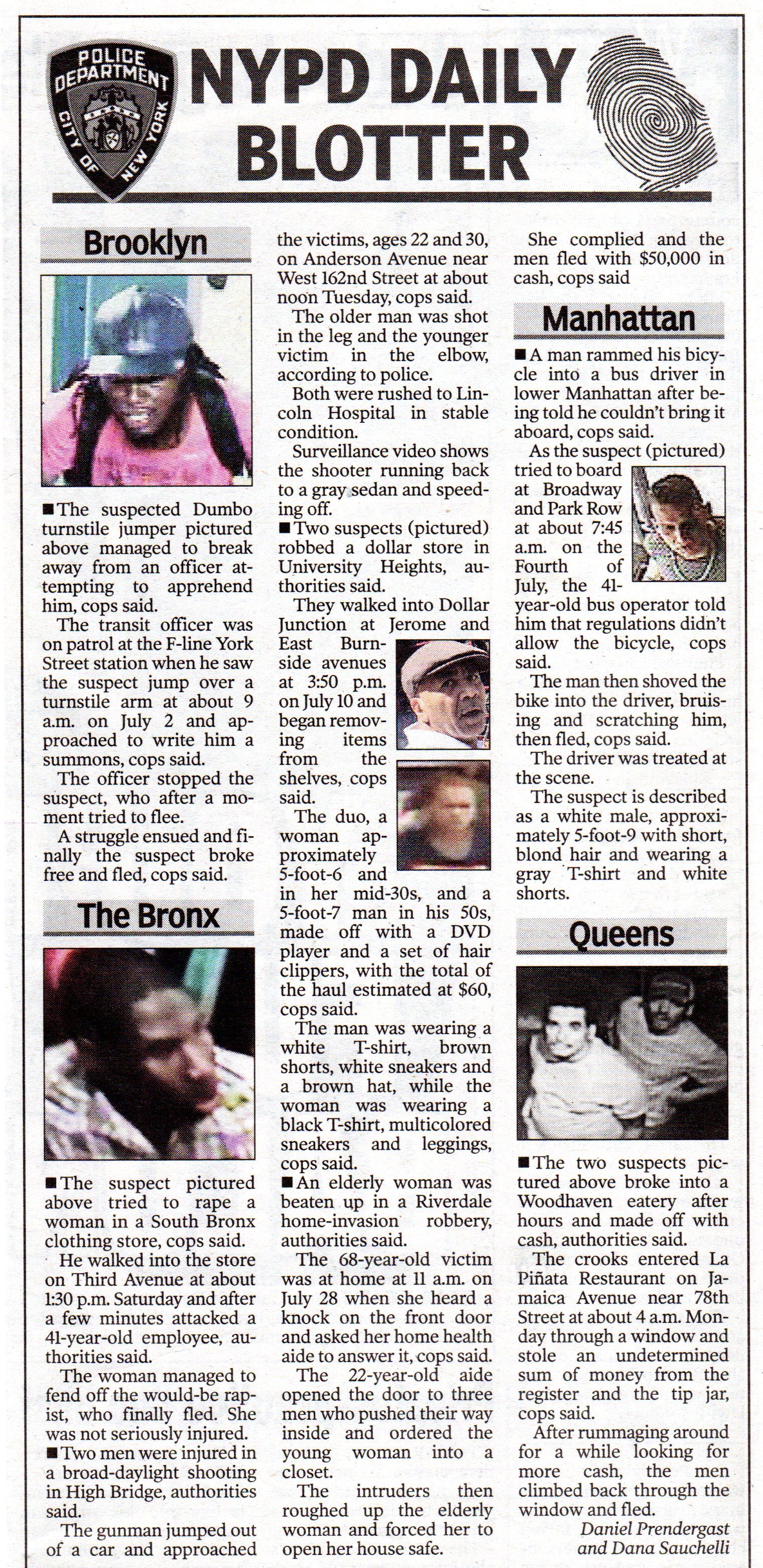 08 — From the police blotter. New York city crime, ah yes. Let me just ask you: Does your cynicism about the reporting of race and crime need a booster shot? Well, that's what Radio Derb's here for. I'm looking at the New York Police Department Daily Blotter here in the August 6th edition of the New York Post. Whaddawe got? Altogether there are seven crime stories on the blotter. In descending order of heinousness, heinosity, whatever: A home invasion with robbery and assault on an elderly woman, an attempted rape, a nonfatal shooting, two store robberies, an arrested turnstile jumper who struggled free from the arresting officer and escaped, then last and, yes, least, a bicycle rider who shoved a bus driver with his bike when the driver wouldn't let it on board the bus. Number of perps: twelve, eleven male and one female. Seven of those twelve perps appear in security camera photos. Unfortunately the photos are poor quality. Just from the photos, two of the perps are clearly black, the others could be any race. But hey, they'll fill out that information in the stories for us, right? [Laughter.] Nope: in 700 words of reporting, the race of a perp is mentioned only once, thus, quote: The suspect is described as a white male, approximately 5-foot-9, with short, blond hair and wearing a gray T-shirt and white shorts. End quote. That white male was the cyclist who shoved his bike at the bus driver, leaving the traumatized driver with, quote, bruises and scratches. Compare the description of the woman in one of the store robberies, quote: A woman approximately 5-foot-6 and in her mid-30s … wearing a black T-shirt, multicolored sneakers and leggings. End quote. No, I didn't cherry-pick Thursday's crime blotter from a week's worth; it was just convenient to hand, and the statistics there are perfectly routine. As I said, any time your cynicism about media crime reporting needs a recharge, we're here for you. |